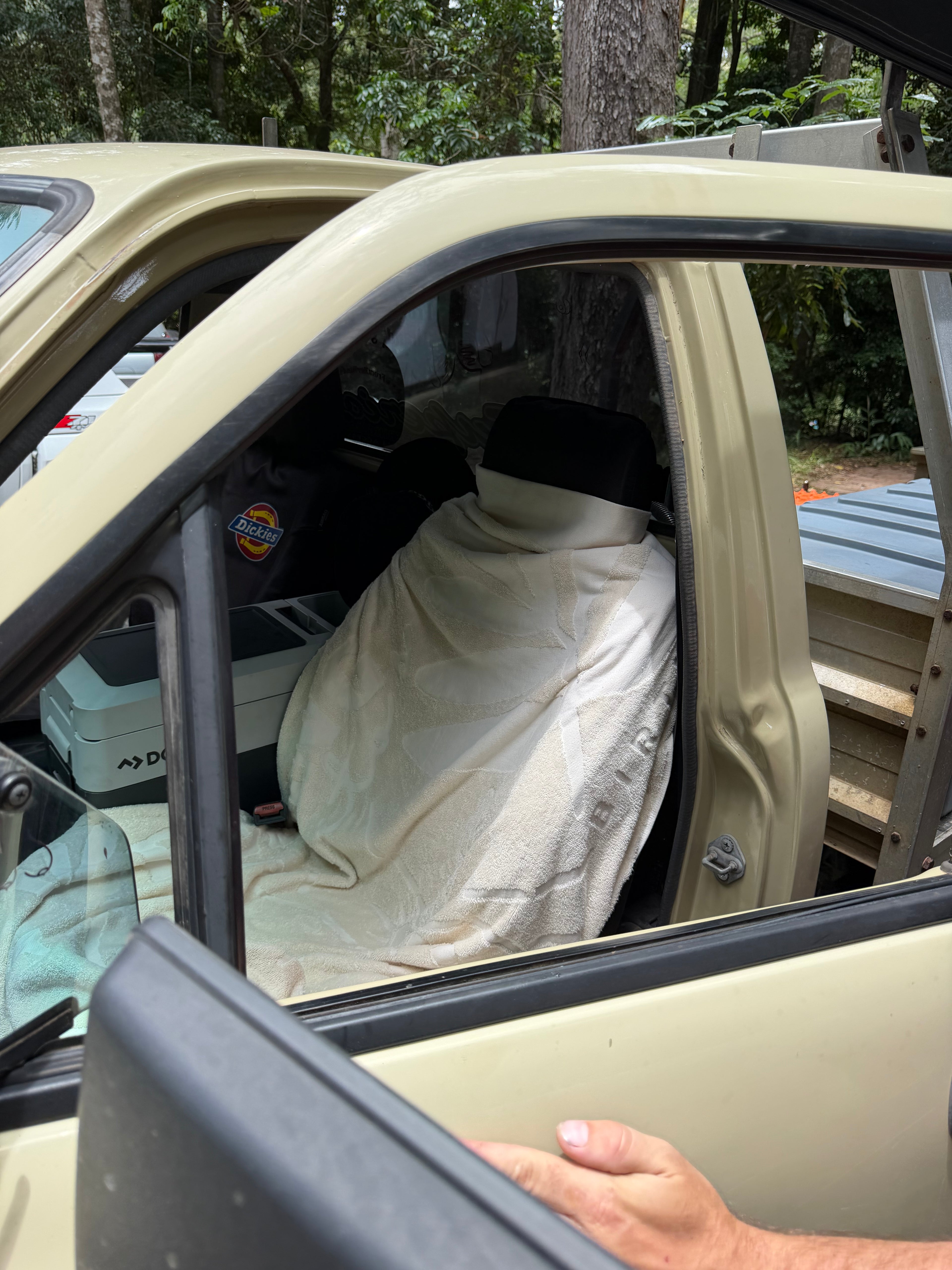 Simply Magnetise the ends of the towel to the side of your rig & enjoy complete privacy